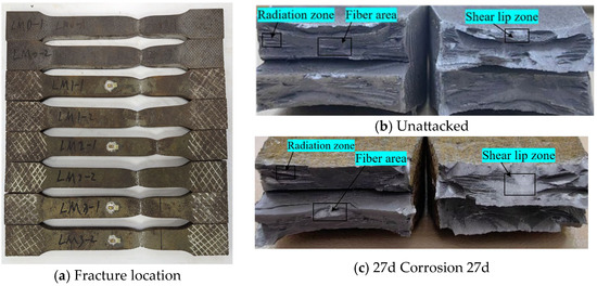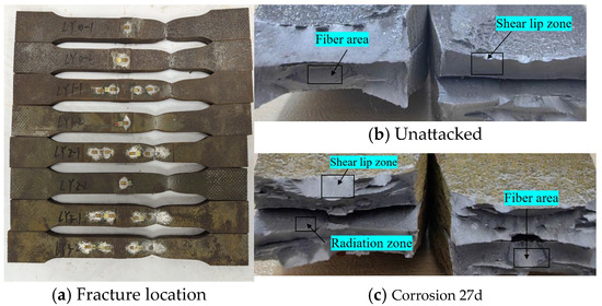 - After 27 days of corrosion, partial fracture surfaces of V-type welded joint specimens appeared at the weld toe, exhibiting brittle fracture characteristics. The remaining specimens demonstrated ductile fracture behavior. The material heterogeneity in both V-type and Y-type welds showed no significant influence on the microstructural morphology of weathering steel specimens, nor did it alter their fracture modes.