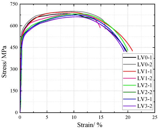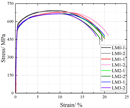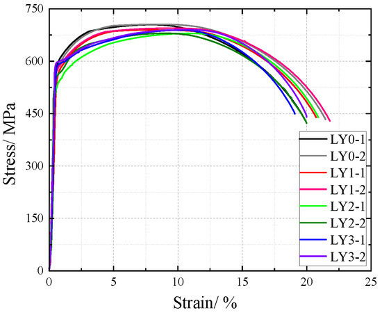 4.2.1. Nominal Stress–Strain Analysis of Base Metal Specimen