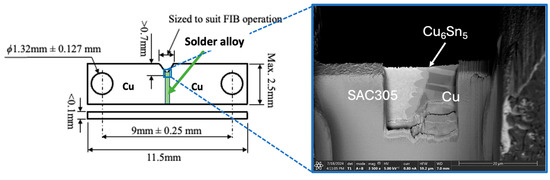 Two laser-cut notched Cu plates (thickness of <0.1 mm) were hand-soldered using Sn-3 wt.%Ag-0.5 wt.%Cu (SAC305) solder (supplied by Nihon Superior Co. Ltd., Osaka, Japan) with a soldering iron set at 350 °C to fabricate a Cu/SAC305/Cu solder joint, as shown in Figure 1. An electron-transparent region, (approximately 0.5 μm in thickness) was prepared at the tip of the notch using a focused ion beam (FIB) milling process (FEI, Scios FIB—Dual Beam SEM). A platinum-rich precursor was deposited to form a protective layer.