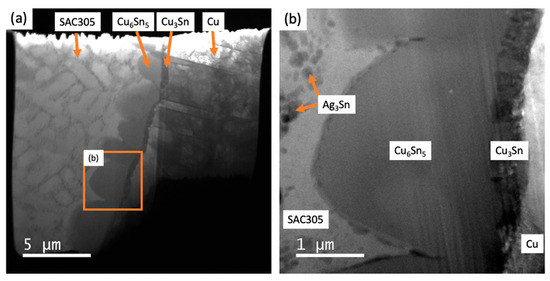 Energy-filtered TEM images of the observation area in the SAC305/Cu6Sn5/Cu3Sn/Cu sample before tensile loading show the dendritic primary Sn within the SAC305 solder alloy microstructure (in Figure 3a) along with the layer of Cu6Sn5. At higher magnification (in Figure 3b), the eutectic Ag3Sn phase is visible in the interdendritic regions, along with a 2–3 μm thick, scalloped layer of Cu6Sn5 and a sub-micron-thick Cu3Sn layer adjacent to the Cu substrate. This distribution of phases is typical of the joint microstructure that results from the reaction between liquid SAC305 and the Cu substrate followed by solidification during soldering [26].