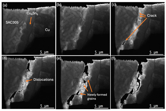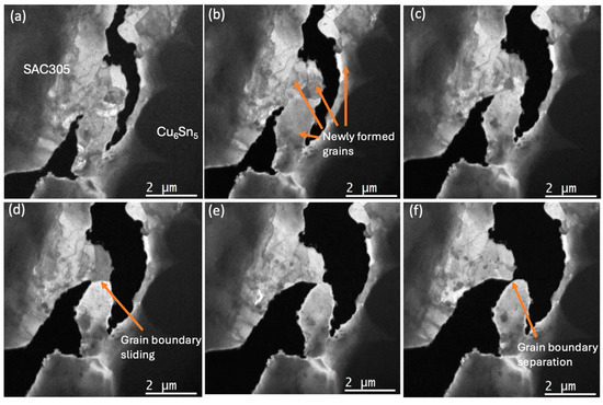 The entire experimental in situ observations are provided as Supplemental Video S1 (×30). Figure 4a–f and Figure 5a–c, and Supplemental Video S2a (×4), show the in situ TEM during tensile loading of the SAC305/Cu6Sn5/Cu solder connection, revealing deformation, dislocation accumulation, crack formation and propagation, and the related formation of recrystallised grain boundaries. The observations were successful in identifying the moment of crack initiation in the SAC305 solder alloy, which occurred in the β-Sn adjacent to the Cu6Sn5 intermetallic, but not within Cu6Sn5 or Cu3Sn or the interface between the SAC305 solder and Cu6Sn5. This mode of failure is similar to that observed in SAC305 solder joints to ball grid array (BGA) packages during thermal cycling [6,7,8,9,10,15].