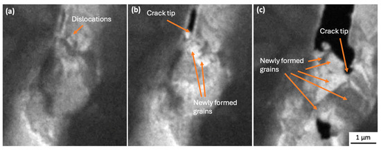 During continuous tensile loading, multiple dislocations could be seen in front of the tip of the advancing crack and then migrating to nearby subgrain boundaries, growing newly formed grains as well as nucleating new subgrains (Figure 6). The limitations of the sample geometry and condition meant that electron diffraction or electron backscatter diffraction (EBSD) could not be used to confirm that grain boundaries were of a high angle. Nevertheless, it is clear that whatever their origin, the newly formed grains, sliding along with newly formed grain boundaries, are playing a part in crack initiation and propagation (Figure 7a–f, Figure 8a–d and Figure 9a,b and Supplemental Video S2b (×4)). This behaviour is consistent with the process of discontinuous recrystallisation (DDRX) (in Figure 6), similar to refs. [5,31,32,33].