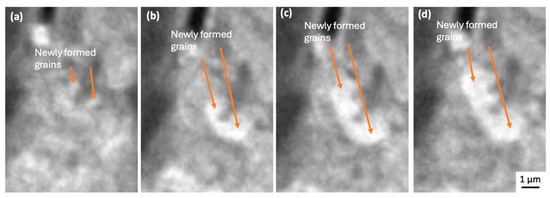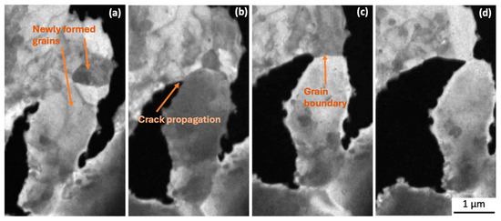 Figure 7a–f, Figure 8a–d and Figure 9a,b and Supplemental Video S2b (×4) show higher-magnification imaging of what appear to be new grains that are growing in areas of dislocation accumulation. It can be seen that the newly formed grain boundary sliding and subsequent grain separation together represent the crack propagation event. Bieler et al. [5] reported that cracks form at random recrystallised boundaries, which then spread through recrystallised regions. Because of the difficulty in determining the orientation of the newly formed grains, we cannot confirm that these grains are a result of recrystallisation that occurred during testing. However, the observations of crack initiation and propagation are consistent with the recrystallisation model.