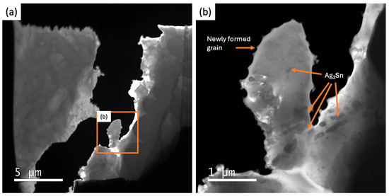 Energy-filtered TEM images of newly formed grains after total separation during testing. (a) Low magnification and (b) higher magnification of square marked region of (a). Newly formed grains containing some Ag3Sn particles.