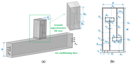 Based on the perforated tortuous-characteristic superstructure with additional trailing plates proposed in this paper, a geometric model is constructed in Comsol Multiphysics. As shown in Figure 1a, the rectangular structure at the lower part of the model is an air-conditioning duct unit, with the internal cavity cross-sectional dimensions of × and a thickness of ; the rectangular structure at the upper part is a unit-cell perforated tortuous-characteristic superstructure, whose internal cavity dimensions are × × (- − ). The perforated plate is arranged on the wall of the air duct, and its thickness is the same as that of the air duct wall. A double-baffle design is adopted inside the structure, and the thickness of the baffles is consistent with that of the outer wall, which is conducive to simplifying the analysis.