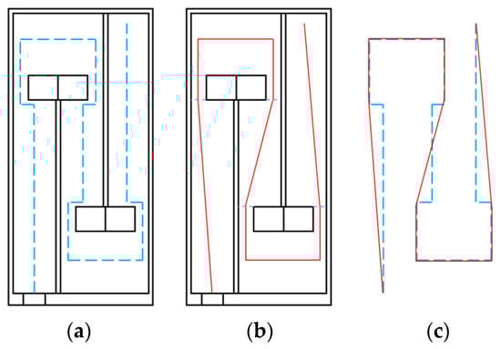 Figure 4 shows a cross-sectional schematic of the acoustic metamaterial single cell. During acoustic wave propagation inside the metamaterial single-cell cavity, the cross-sectional area of the propagation path varies significantly, resulting in a more complex effective path—as indicated by the blue dashed line in Figure 4a. To facilitate the calculation of and , the paths around the trailing plates protruding from the end of each baffle are simplified to represent the hypotenuse of a right triangle formed by the original equivalent path. The simplified path is shown as the red solid line in Figure 4b. A comparison of path lengths between the original blue dashed equivalent path and the simplified red solid equivalent path is presented in Figure 4c.