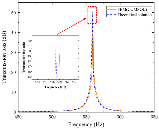 As observed in Figure 5, the theoretical and simulation curves show good agreement. In the simulation, the structure resonates at approximately 560 Hz, with a peak transmission loss (TL) of 49.346 dB. The theoretically calculated TL peak is slightly shifted leftward and marginally higher, reaching 50.395 dB at 559 Hz. The resonance frequency error between the two is 0.178%, and the TL peak error is 2.125%. The errors primarily stem from the following: Acoustic radiation reactance exists at the corners where the cross-sectional area of the metamaterial channels changes. The effective path length of the actual wider channels is slightly shorter than the theoretical value calculated in Table 6; specifically, the total effective channel length in the theoretical model (Table 5) is slightly longer than the actual length. This results in a slight left shift of the theoretical curve and a slightly higher TL value, which is consistent with practical scenarios. These findings verify the feasibility of the theoretical design for the single-cell muffler with perforated tortuous-characteristic metamaterial features.