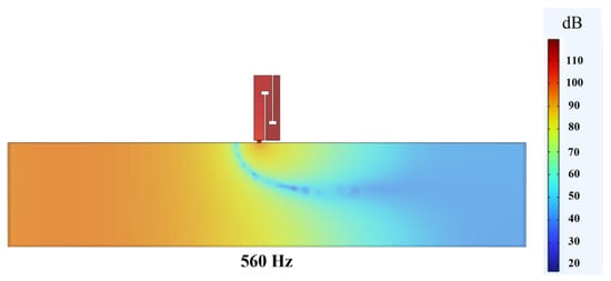 The sound pressure level distribution of the air duct waveguide and the double-baffle perforated tortuous-characteristic metamaterial muffler is shown in Figure 6 below. At the entrance where the air duct leads into the interior of the metamaterial muffler, the sound pressure level drops abruptly to the minimum, enabling effective elimination of sound waves at a frequency of 560 Hz and thus achieving the noise reduction effect.