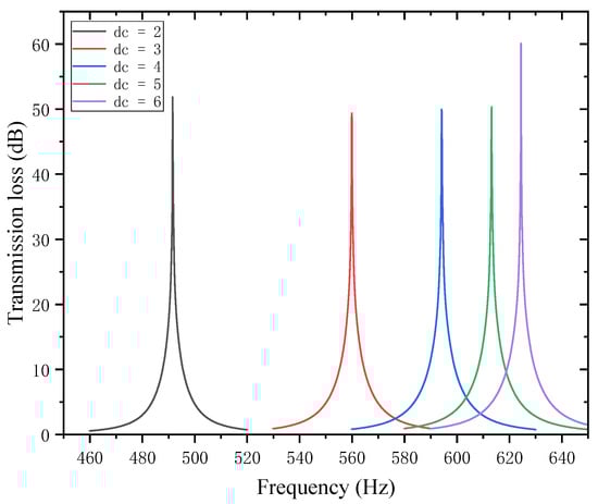 Sound waves’ interference patterns and overall equivalent path length and resonance frequency are also impacted by variations in the thickness of the trailing plates that are attached to the first and second partitions. With other parameters kept unchanged, the thicknesses of the trailing plates attached to the first and second partitions and were adjusted to 1, 4, 7, 10, and 13 mm, respectively. The sound transmission loss curves of the acoustic metamaterial under these corresponding parameters were calculated, and the amplitude–frequency characteristic curves are shown in Figure 26 below, with the comparative curves of noise reduction performance shown in Figure 27.
