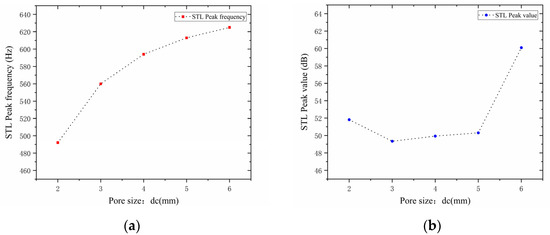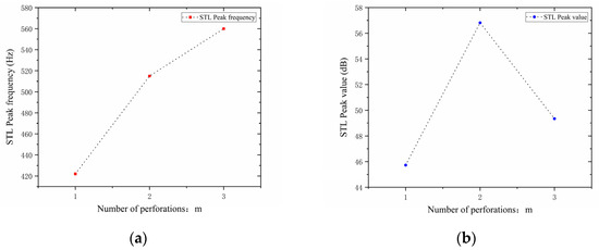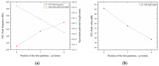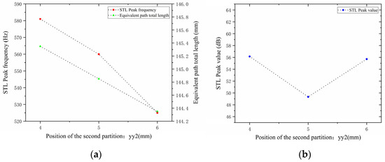 Comparison of noise reduction STL performance under different positions of the second partition: (a) STL peak frequency; (b) STL peak magnitude.