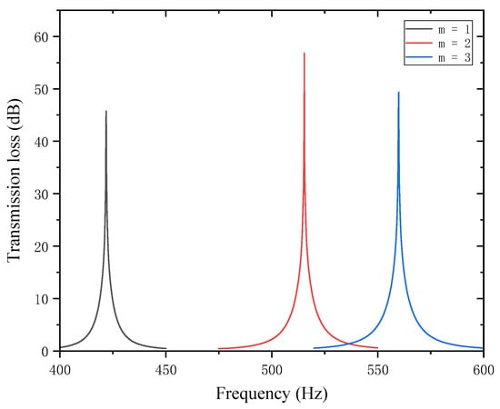 As shown in Figure 26 and Figure 27, increasing and leads to an increase in the total equivalent path length, with the peak frequency shifting toward lower frequencies. The STL peak magnitude exhibits the same trend: it first decreases, then increases, and decreases again as the length increases. Specifically, the STL peak magnitude reaches the maximum when is 7 mm and when is 1 mm or 7 mm, which is attributed to intense interference and high acoustic impedance. Moreover, the peak magnitudes are almost all above 50 dB. Therefore, the thickness of the partition trailing appendage plates should be adjusted appropriately to achieve the optimal sound attenuation effect.