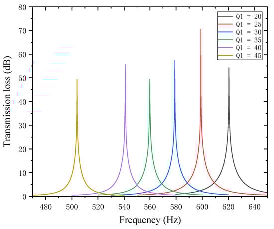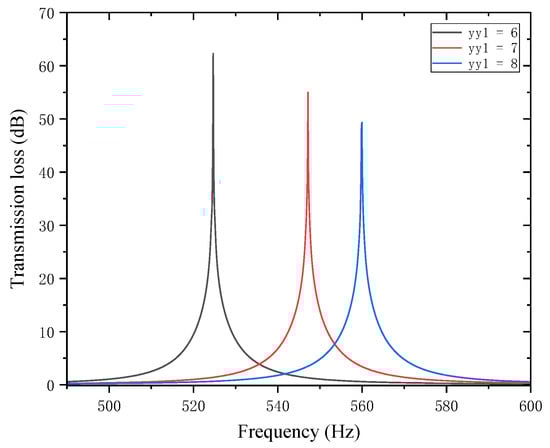 As can be seen from Figure 18 and Figure 19, changes in affect both the STL peak frequency and magnitude. With an increase in , the total equivalent path length decreases, causing the peak frequency to shift toward higher frequencies, and the shifting rate gradually slows down—rising sharply in the 6–7 mm range and gently in the 7–8 mm range. Meanwhile, as increases, the peak magnitude decreases, with the decreasing rate slowing down gradually. Therefore, when setting the position of the first partition, it should be reasonably adjusted to optimize the noise reduction performance.