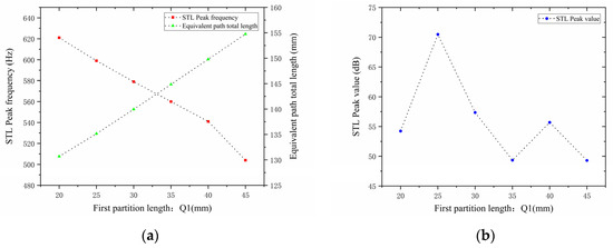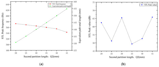 Comparison of noise reduction STL performance under different lengths of the second partition: (a) STL peak frequency; (b) STL peak magnitude.