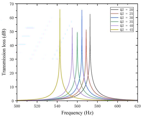 As can be seen from Figure 16 and Figure 17, changes in also affect both the STL peak frequency and magnitude. With an increase in , the total equivalent path length increases, causing the peak frequency to shift toward lower frequencies, and the shifting rate gradually accelerates, with a sharp drop in resonance frequency in the 40–45 mm range. Compared with the first partition, results in a smaller decrease in the STL peak frequency, indicating that the first partition plays a primary regulatory role, while the second partition functions as a fine-tuning element. When is 20, 30, and 45 mm, the STL peak magnitude exceeds 60 dB, and in other cases, it also exceeds 45 dB. Therefore, when setting the length of the second partition, it should be reasonably adjusted to exert its fine-tuning effect and optimize the noise reduction performance.