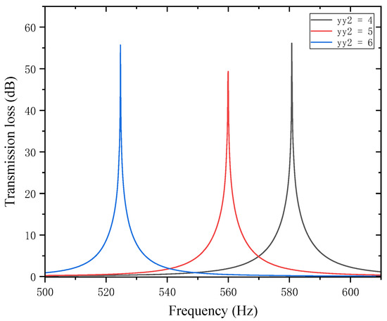 Similarly, with other structural parameters of the perforated tortuous-characteristic acoustic metamaterial kept unchanged, the position of the second partition was adjusted to 4, 5, and 6 mm. The corresponding sound transmission loss curves of the acoustic metamaterial under these parameters were calculated, and the amplitude–frequency characteristic curves are shown in Figure 20 below. The comparative curves of noise reduction performance are shown in Figure 21.