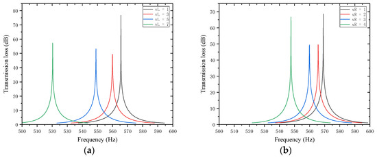 Influence of the length of trailing plates attached to the first partition on the sound transmission loss of acoustic metamaterial mufflers: (a) left trailing plate; (b) right trailing plate.