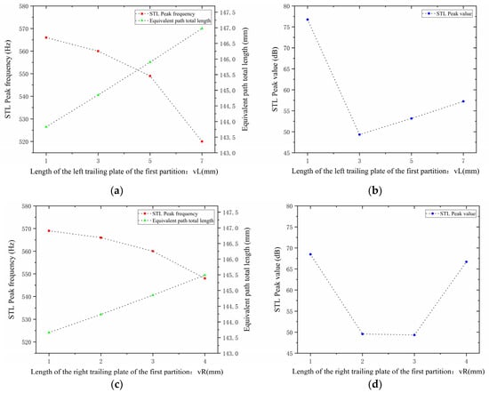 Comparison of noise reduction STL performance under different lengths of trailing plates attached to the first partition: (a) peak frequency of STL for the left trailing plate; (b) peak magnitude of STL for the left trailing plate; (c) peak frequency of STL for the right trailing plate; (d) peak magnitude of STL for the right trailing plate.