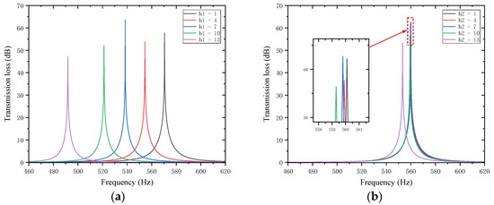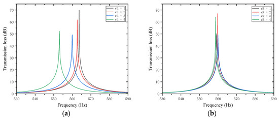 Influence of different thicknesses of partition trailing plates on the sound transmission loss of acoustic metamaterial mufflers: (a) trailing plates of the first partition; (b) trailing plates of the second partition.