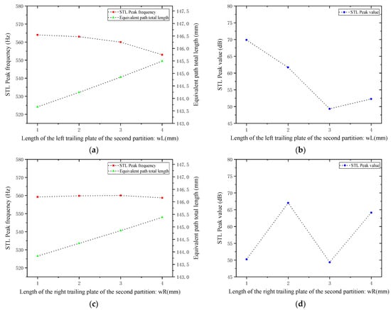 Comparison of noise reduction STL performance under different lengths of trailing plates attached to the second partition: (a) peak frequency of STL for the left trailing plate; (b) peak magnitude of STL for the left trailing plate; (c) peak frequency of STL for the right trailing plate; (d) peak magnitude of STL for the right trailing plate.