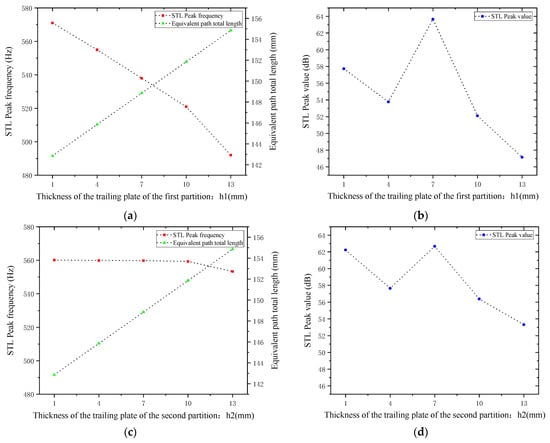 Comparison of noise reduction STL performance under different thicknesses of partition trailing plates: (a) Trailing plate of the first partition and STL peak frequency. (b) Trailing plate of the first partition and STL peak magnitude. (c) Trailing plate of the second partition and STL peak frequency. (d) Trailing plate of the second partition and STL peak magnitude.