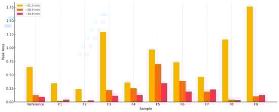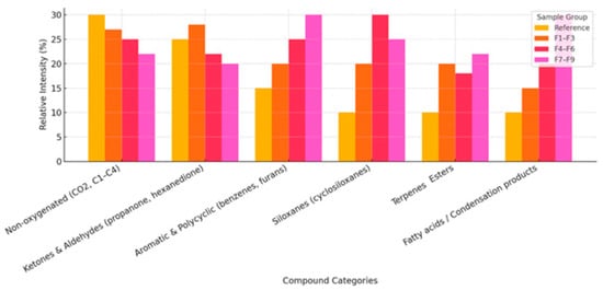 The emission of volatile organic compounds (VOCs) from cement mortars was assessed using gas chromatography coupled with mass spectrometry (GC-MS) [26,27]. Analyses were performed with an Agilent GC-MS system (GC 7890B/MS 5977B) equipped with a DB-5MS column (30 m × 0.25 mm × 0.25 μm; Agilent, Santa Clara, CA, USA). VOCs were extracted using a FIB-C-WR-95/10-P1 Carbon WR/PDMS fiber (PALSystem, CTC Analytics AG, Zwingen, Switzerland) installed in a Gerstel MPS robotic autosampler (Gerstel GmbH & Co. KG, Mülheim an der Ruhr, Germany). A 2.5 ppm solution of caryophyllene was used as the internal standard. The fiber was preconditioned at 270 °C for 30 min and additionally heated for 1 min before and after each run. Samples were conditioned at 60 °C for 10 min, followed by VOC extraction at the same temperature for another 10 min, and analytes were desorbed in the injector for 5 min. Instrument settings included an injector temperature of 250 °C, a split ratio of 10:1, and a helium flow rate of 1.0 mL·min−1. The oven temperature program started at 40 °C (2 min hold), ramped to 150 °C at 5 °C·min−1, and then to 250 °C at 10 °C·min−1. The quadrupole, ion source, and transfer line temperatures were set to 150 °C, 230 °C, and 250 °C, respectively [28]. Compound identification was performed using the NIST17 spectral library [29].