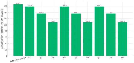 The LCA results, expressed in Mg CO2-eq/year, reveal a clear trend: samples with increasing biochar content exhibit progressively lower environmental impacts across all stages. For the reference sample, total annual emissions reached 166.06 Mg CO2-eq/year, with A1 (raw materials) being the dominant contributor (99.64 Mg/year) (Figure 7).