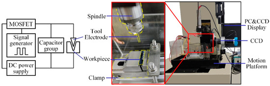 The micro-EDM machine tool used in the experiment is independently developed by Harbin Institute of Technology. This machine tool system comprises a high-resolution motion stage, a high-speed spindle, a transistor-RC micro-energy pulse power supply, a discharge state detection device, and a servo control system. The modular structure of the machine tool and the schematic diagram of the power supply are shown in Figure 1.