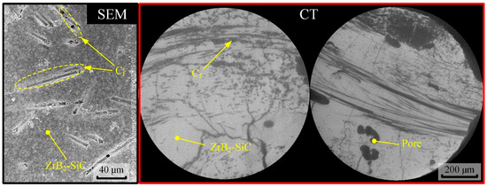 As a representative of Cf-UHTC (carbon-fiber-reinforced ultra-high temperature ceramic) materials, Cf-ZrB2-SiC has excellent mechanical properties. To visually illustrate the morphology and microstructure of the material, the surface and interior of the material were characterized, as shown in in Figure 2, using scanning electron microscopy (FESEM SU8010, HITACHI, Tokyo, Japan) and 3D-CT microscopy (Xradia 520 Versa, Carl Zeiss, Oberkochen, Germany).