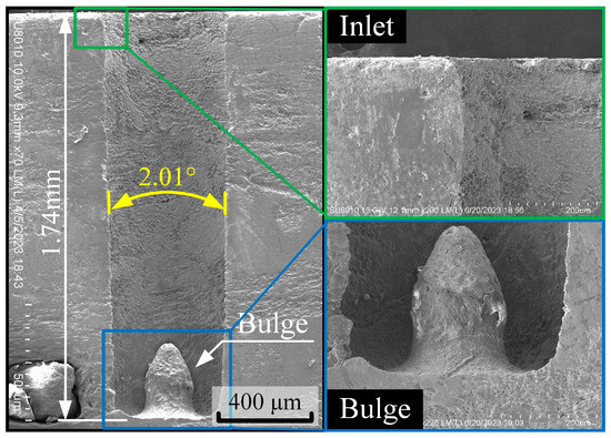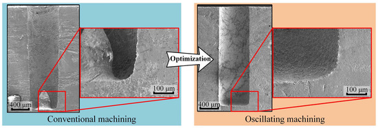 Based on the experimental findings in the authors’ previous studies, the maximum aspect ratio achieved in conventional machining was approximately 8.4, whereas this value significantly improved to 13.1 when employing an electrode-assisted oscillating device. In the machining quality aspect, defects at the bottom of blind holes were effectively eliminated through this machining method, where no protrusion or severe ablation were observed in the SEM images [21]. The blind-hole machining results of the oscillating machining method and conventional machining method are visually compared in Figure 15. Based on simulation research, it can be known that the protrusion at the bottom of the hole is formed by debris forming a low-speed zone, which is continuously sintered to form this structure. However, during oscillating machining, the low-speed zone problem is effectively solved, so the bottom of the hole will not form a protrusion.