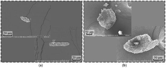 When the tool electrode exhibits no significant deformation, workpiece overcutting and bottom surface defects are highly likely to be attributable to issues in the interelectrode flow field. The state of the interelectrode flow field is primarily influenced by the electrical erosion products in the kerosene medium. Therefore, debris generated during micro-hole machining was collected for analysis. Observations revealed a substantial presence of carbon fiber and ceramic fragments within the erosion products, as illustrated in Figure 4.