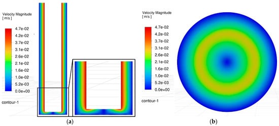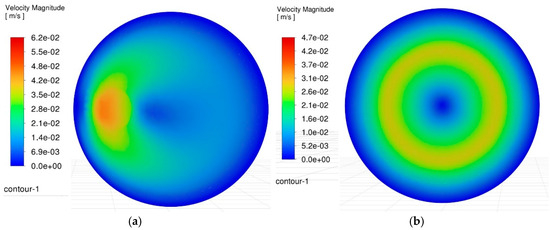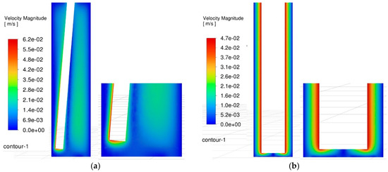 The bottom gap of the micro-hole serves as the primary discharge area, and its flow field condition directly impacts the progress of the EDM. Deterioration of the flow field at the bottom gap can lead to issues such as reduced machining efficiency and excessive tool wear. Moreover, it is one of the main reasons for encountering machining limits and defects during micro-hole machining. Therefore, a radial plane was intercepted in the bottom gap flow field region to analyze the differences in the flow field velocity of the two gaps, and the comparison results are shown in Figure 9.