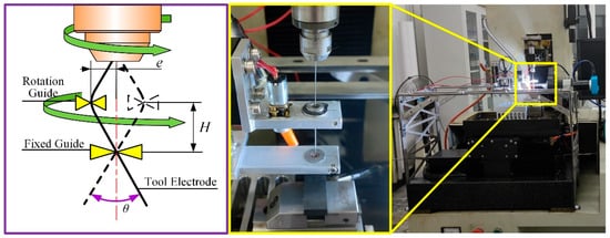 To improve the interelectrode flow field conditions, the authors previously developed a novel auxiliary machining device. This system utilizes dual guide mechanisms to precisely control electrode motion, significantly enhancing agitation effects and thereby improving machining efficiency and quality. The working principle and installation setup are illustrated in Figure 6. The device operates through the coordinated action of a rotary guide and a fixed guide, enabling the rod-shaped electrode to perform conical motion around the spindle’s central axis. By changing the distance (H) between these two guides, the oscillating angle of the electrode can be changed. This innovative design fundamentally alters both the kinematic behavior of the tool electrode and its agitation effectiveness in the working area.