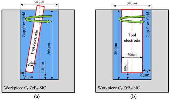 The target hole diameter is set to 0.5 mm, and the simulation focuses on the gap flow field at a depth of 2 mm. Schematic illustrations of the flow field models for both scenarios are provided in Figure 7.