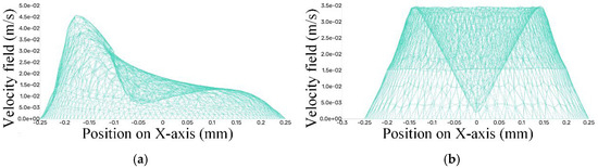 Based on the velocity contour plots of the bottom gap flow field, it can be observed that in the conventional machining mode, the flow velocity in the central region of the gap at the bottom of the hole is significantly lower. This phenomenon inevitably leads to the substantial retention and accumulation of machining debris, providing an intuitive explanation for the causes of bottom surface defects in blind-hole machining as mentioned above. In contrast, under the oscillating machining condition, the bottom gap flow field exhibits distinct characteristics. Although there are still low-velocity regions, thanks to the conical oscillating motion of the electrode, the position of this low-velocity area is not fixed but continuously changes around the central axis of the hole. This motion characteristic effectively prevents the local accumulation of debris and plays a crucial role in optimizing the machining results. To more intuitively quantify the velocity field distribution in this plane, the variation curves of the velocity along the X-direction for each node in the flow field were plotted using CFD software, as shown in Figure 10.