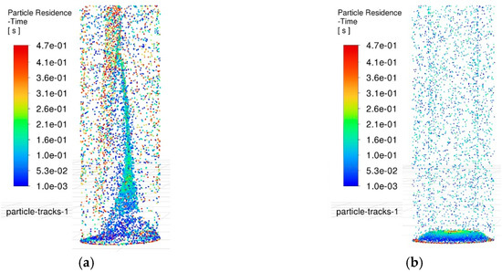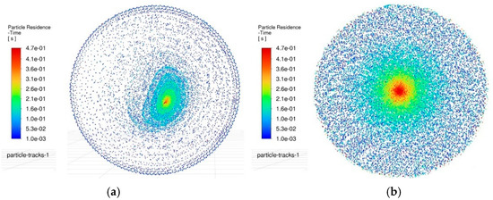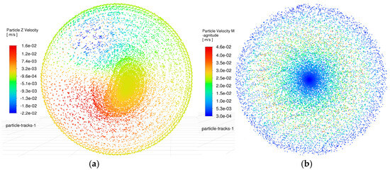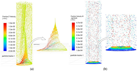 Based on the aforementioned simulation conditions, transient simulation analysis was performed on the complex flow field described by the discrete phase model, using a time step of 10−4 s. After computation and data processing, the simulation results were output as shown in Figure 11. This figure visually illustrates the overall distribution of particles inside the hole when the time step reaches 4700. Additionally, the color gradient and particle density not only represent the spatial positions of the particles within the hole but also reflect the relationship between motion time and their distribution state.