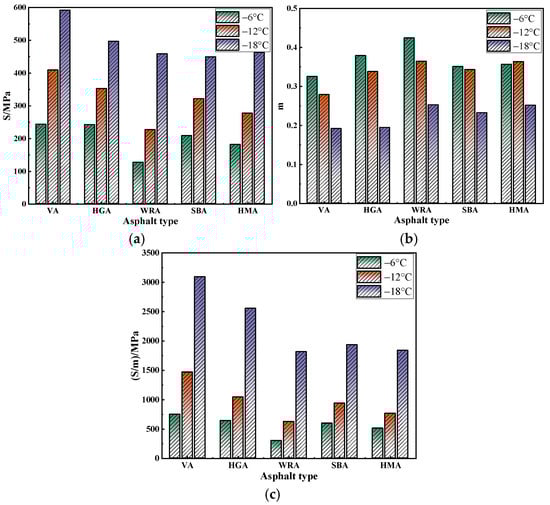 - A decrease in temperature leads to the deterioration of the low-temperature performance of high-modulus asphalt. The low-temperature limit temperatures of WRA and HMA are −12 °C, while those of SBA and HGA are −6 °C. However, compared with HGA, the value of SBA is extremely close to the specification value. There are certain limitations in evaluating low-temperature performance solely by the S value or m value; the S/m index can be used to better evaluate the low-temperature performance of high-modulus asphalt, and the variation law of its value is similar to the S value.