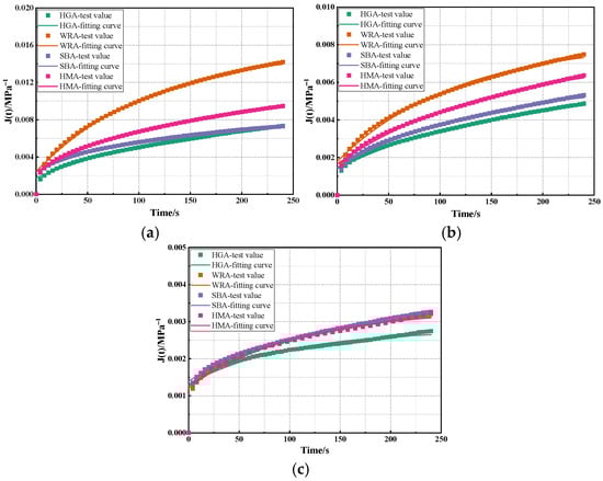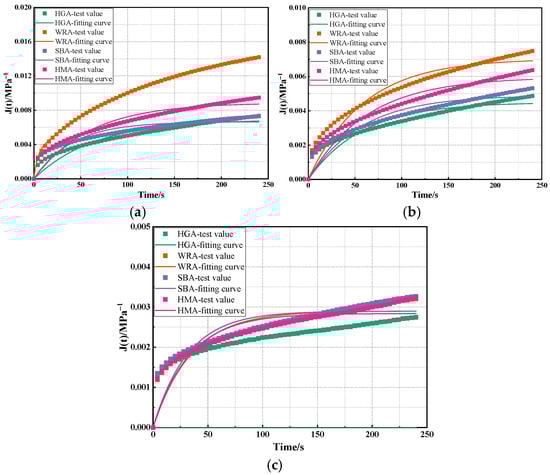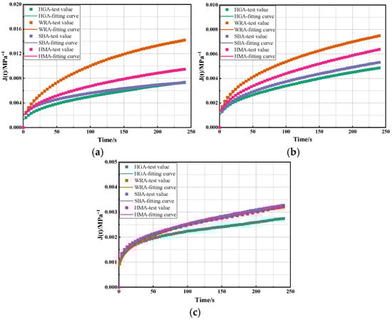 Based on the TPS model, calculations were conducted on the creep curves of several high-modulus asphalts obtained from BBR tests at different temperatures, with the results being shown in Figure 4 and Table 3.
