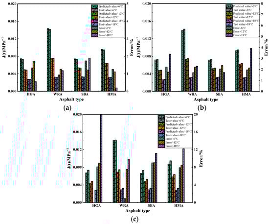 This study respectively employed the Burgers model, TPS model, and FPS model to evaluate the low-temperature creep behavior of several high-modulus asphalts at different temperatures. It was found that, for the low-temperature performance of high-modulus asphalt, the Burgers model exhibits higher fitting accuracy, and the variation in its parameters is more regular. Therefore, compared with the other two constitutive models, the Burgers model is considered more suitable for evaluating the low-temperature performance of high-modulus asphalt. However, this analysis is only from the perspectives of fitting curve accuracy and parameter variation rules. The applicability of a constitutive model should be further analyzed through its prediction effect. For this purpose, this study took the final values of the creep stage from BBR tests of several high-modulus asphalts at different temperatures as the benchmark, evaluated the applicability of several constitutive models, and analyzed the error between the predicted values and test values of these models, with the results being shown in Figure 6.