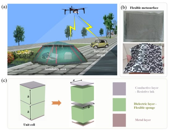 Figure 1a presents a UAV EM detection countermeasure scenario based on the flexible metasurface: the UAV is equipped with EM sensing loads and emits EM waves to the ground to perform reconnaissance tasks; the vehicle on the right is a conventional detectable target without EM cloaking measures, whose EM scattering characteristics are not regulated, making its echo signals easy to be captured and identified by the UAV; the “Invisibility area” (tent structure) on the left, constructed by the flexible metasurface, can achieve precise regulation of the phase, amplitude and polarization state of the incident EM waves by virtue of subwavelength microstructures. On one hand, it can guide EM waves to diffract around the tent as well as the personnel and equipment inside to suppress scattered echoes; on the other hand, it can simulate the EM response of background environments such as the ground and vegetation, reducing the difference in EM characteristics between the tent and the surrounding environment, thus making it difficult for the UAV to distinguish the target from the background from the echoes.