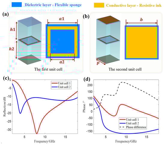 Figure 2d, the phase difference between the two unit cells is over 120° in the 4.4–16 GHz band, and especially close to 180° in the 8–12 GHz band. Combined with the difference in their resonant frequencies and the large phase difference over a wide frequency band, according to the far-field radiation theory, after specific array arrangement, the reflectivity of the metasurface can be further reduced by 5–10 dB on the basis of the original unit cells (for example, the original reflectivity of unit cell 2 is approximately −10 dB, which can reach −15 to −20 dB after array arrangement), thereby improving the broadband absorption performance as a whole.