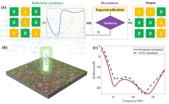 Figure 3a shows the design flowchart of the array metasurface: first, the expected wave absorption performance is specified (such as the reflectivity threshold at specific frequency points/bands); a random permutation matrix containing only 0 s and 1s is generated via MATLAB (It is developed by MathWorks, Inc., located in Natick, MA, USA, and has been purchased by Zhejiang University); and the reflectivity of the array metasurface corresponding to the permutation matrix is calculated using the far-field formula, and the result is compared with the expected reflectivity. If the expected performance is not met, the permutation matrix is discarded and a new one is regenerated until a permutation matrix that meets the expected performance is obtained.