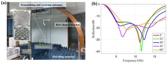 Figure 4b). At normal incidence, the metasurface had two resonance points (5.6 GHz and 11.2 GHz) in the 2–18 GHz band. As the incident angle increased, the resonance points shifted to higher frequencies. At an incident angle of 45°, the bandwidth with reflectivity <−10 dB was the largest (4.37–18 GHz). At an incident angle of 60°, the bandwidth was reduced to 5–18 GHz. At normal incidence, the bandwidth was 4.16–14.4 GHz. The results show that the flexible metasurface has the optimal wave absorption performance at a 45° oblique incidence. Since the oblique incidence angles of EM waves from detection systems such as radars are usually 45–60°, this metasurface is suitable for SAR imaging cloaking tests.