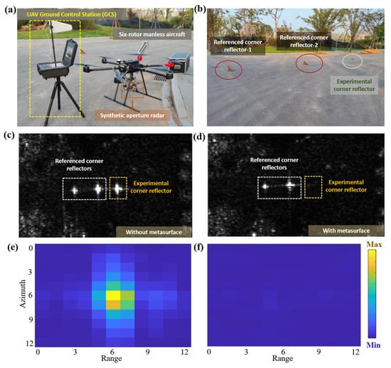 Figure 5e,f show the magnified views of the corresponding imaging areas of the corner reflectors. The results show that the imaging brightness of the corner reflector is significantly reduced after loading the metasurface, indicating that the metasurface can effectively reduce the echo energy of the object and has SAR imaging cloaking performance.