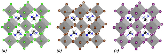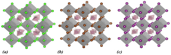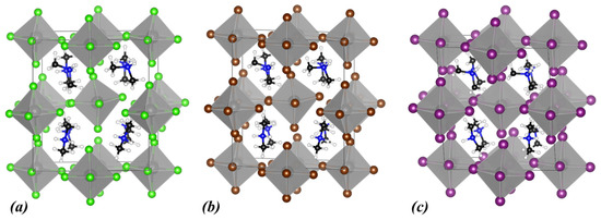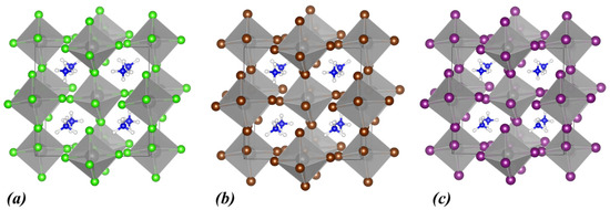 Calculated crystal structures of (a) MA2ZrCl6, (b) MA2ZrBr6, and (c) MA2ZrI6. In the polyhedral structures, Zr is depicted as grey spheres, and the halogen atoms are shown as green (Cl), brown (Br), and purple (I) spheres. Within MA+, N atoms are shown as blue, C atoms as black, and H atoms as white spheres.