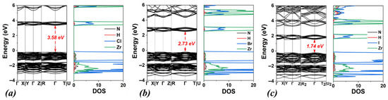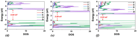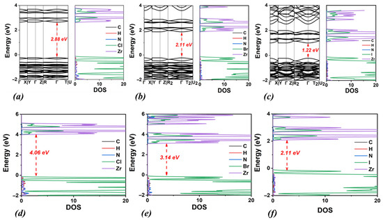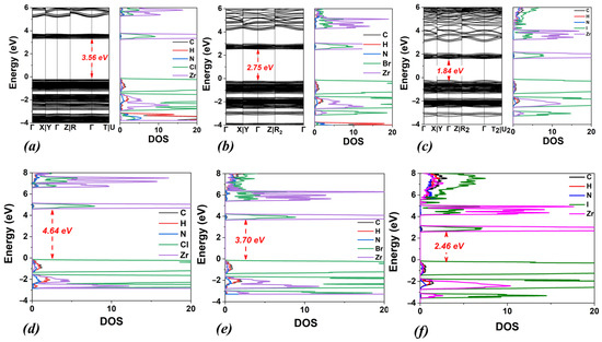 Calculated band structures and densities of states (DOSs) using the PBE functional for (a) DMA2ZrCl6, (b) DMA2ZrBr6, and (c) DMA2ZrI6. Corresponding DOS calculated using the HSE06 functional are also shown for (d) DMA2ZrCl6, (e) DMA2ZrBr6 and (f) DMA2ZrI6.