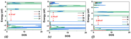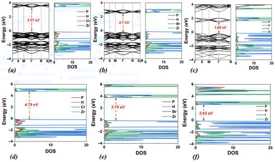 Calculated band structures and densities of states (DOSs) using the PBE functional for (a) (PH4)2ZrCl6, (b) (PH4)2ZrBr6, and (c) (PH4)2ZrI6. Corresponding DOSs calculated using the HSE06 functional are also shown for (d) (PH4)2ZrCl6, (e) (PH4)2ZrBr6, and (f) (PH4)2ZrI6.