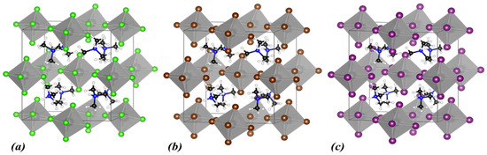 Calculated crystal structures of (a) DMA2ZrCl6, (b) DMA2ZrBr6, and (c) DMA2ZrI6. In the polyhedral structures, Zr is depicted as grey spheres, and the halogen atoms are shown as green (Cl), brown (Br), and purple (I) spheres. Within DMA+, N atoms are shown as blue, C atoms as black, and H atoms as white spheres.