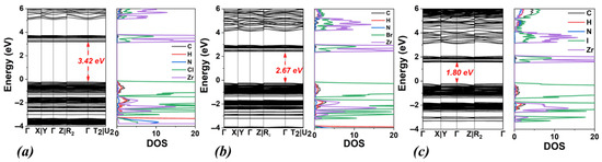 For TMA2ZrCl6, the band gap energies are 3.42 eV (PBE) and 4.54 eV (HSE06). These values are slightly lower (by ~0.1 eV) than those of DMA2ZrCl6 (3.56 eV with PBE and 4.64 eV with HSE06). Similarly, TMA2ZrBr6 exhibits band gap energies of 2.67 eV (PBE) and 3.59 eV (HSE06), which are also lower by ~0.1 eV compared to DMA2ZrBr6 (2.75 eV with PBE and 3.70 eV with HSE06). Finally, for TMA2ZrI6, the calculated bandgap energy values are 1.80 eV (PBE) and 2.53 eV (HSE06).