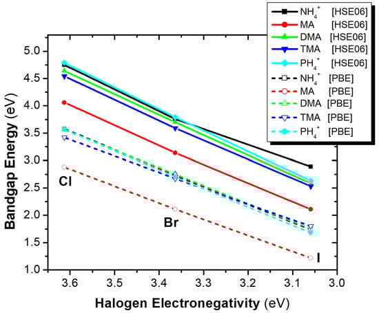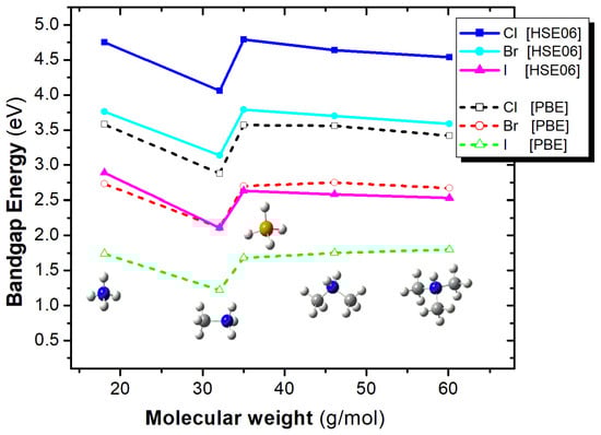 Let us now shed more light on the effect of the A-site substitution and the X-site substitution on the bandgap energy. Regarding the A-site effect, for both functionals and for all X anions, MA in A-site results in the smallest bandgap energy, while the remaining four cations, i.e., NH4+, PH4+, DMA, and TMA, result in similar bandgap energies, as seen in Figure 11. Specifically, the bandgap energy has been plotted as a function of the molecular weight of the A-site cation, since molecular weight can be used as a proxy for the size of the molecular ion, which is responsible for the observed changes in the lattice parameters (Figure 11).