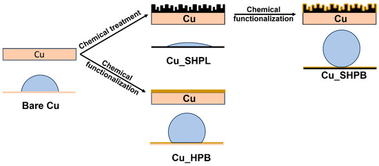 Schematic illustration of the wettability of the copper substrate and surface modification to achieve non-wetting surfaces.